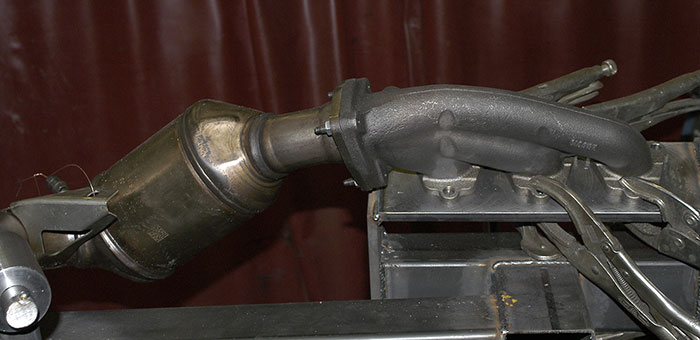 Oben: serienmässige, gusseiserne Krümmer mit Katalysator und einem Teil des restlichen Serienauspuffs.