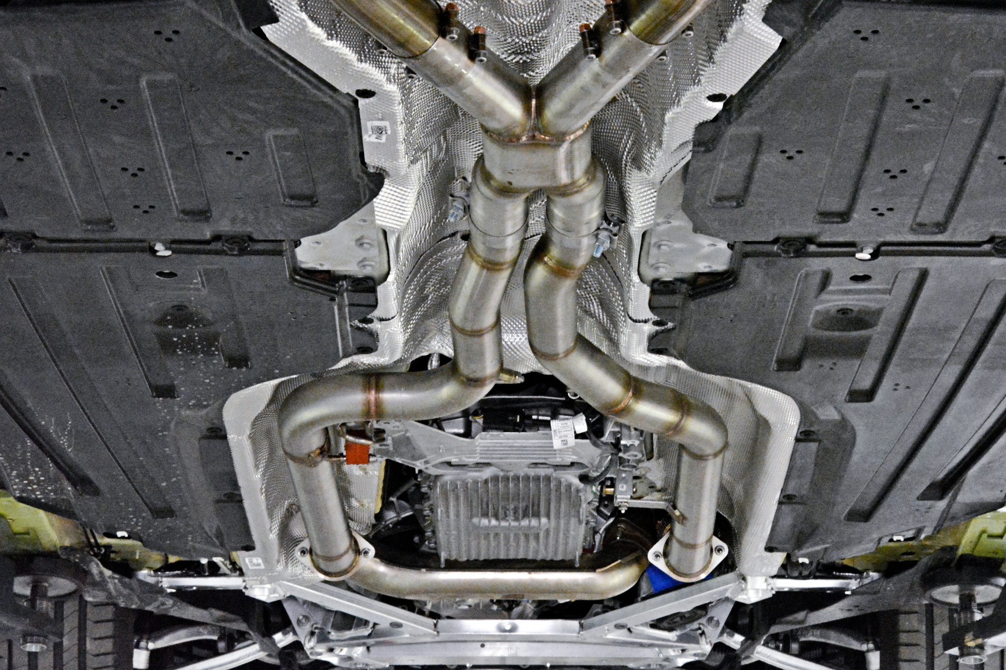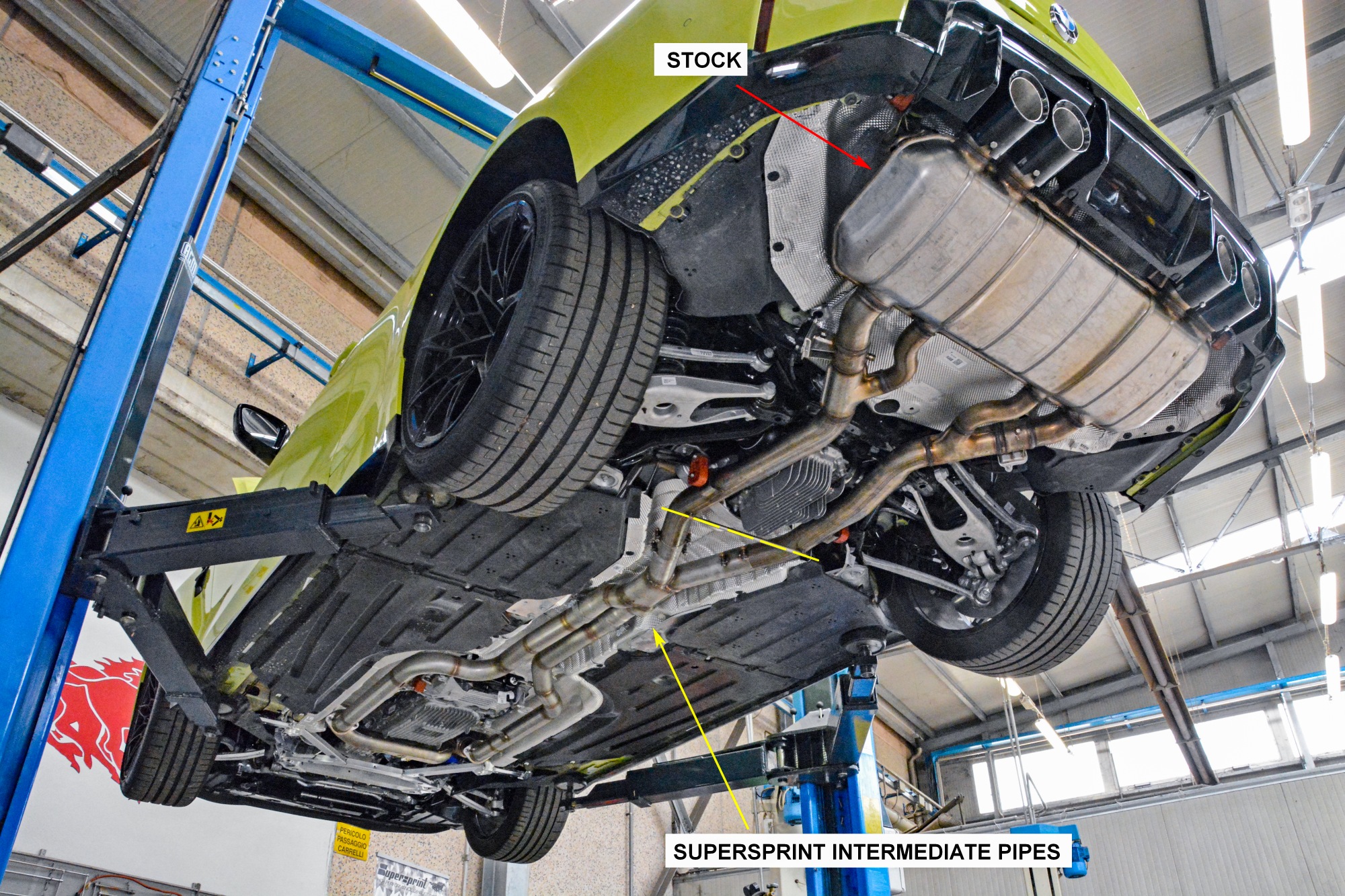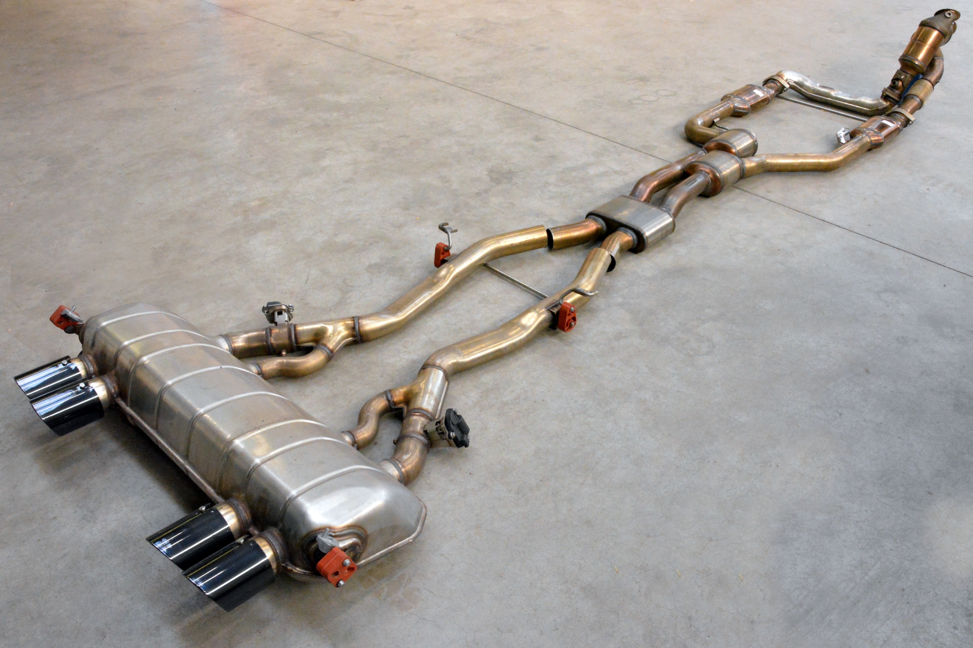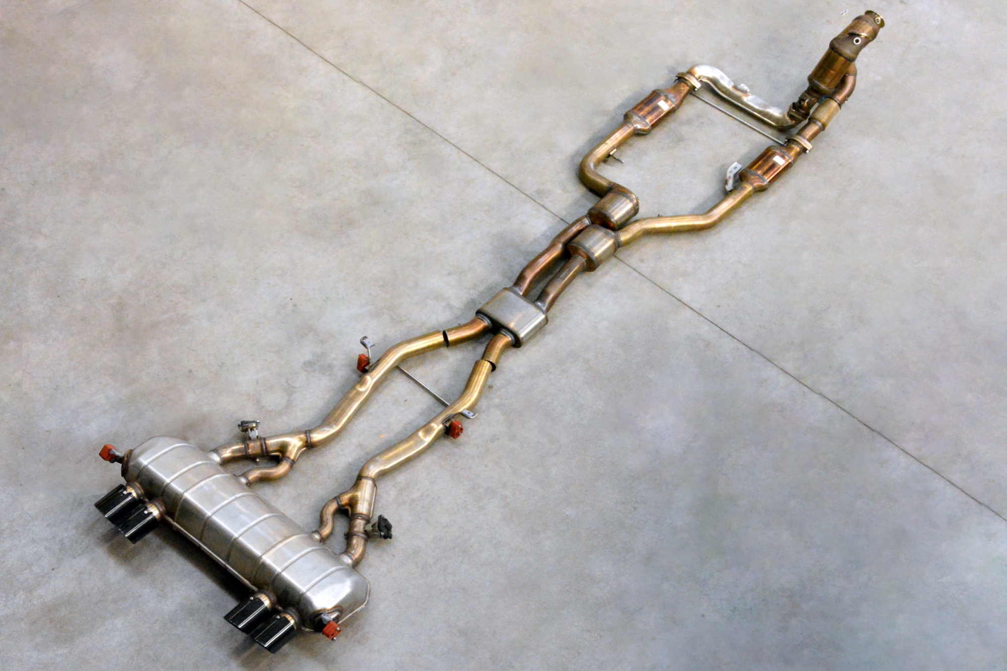 On the Euro-spec version, this exhaust setup deletes the R&L secondary catalytics, the OPFs (particle filter) and the mid resonator, mantaining the stock downpipes with the primary cats and the BMW Factory rear muffler in place.