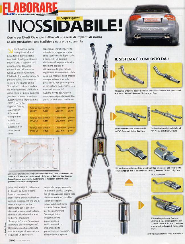 Unter den Fans hört man Stimmen, dass dieses Fahrzeug nicht die Drehmomentwerte und die Leistung bringt, die vom Hersteller mit den vier Ringen angegeben werden. Deshalb hat sich Supersprint um die Entwicklung und Realisierung einer Hochleistungsabgasanlage gekümmert, die das "ganz allein" in Ordnung bringt.