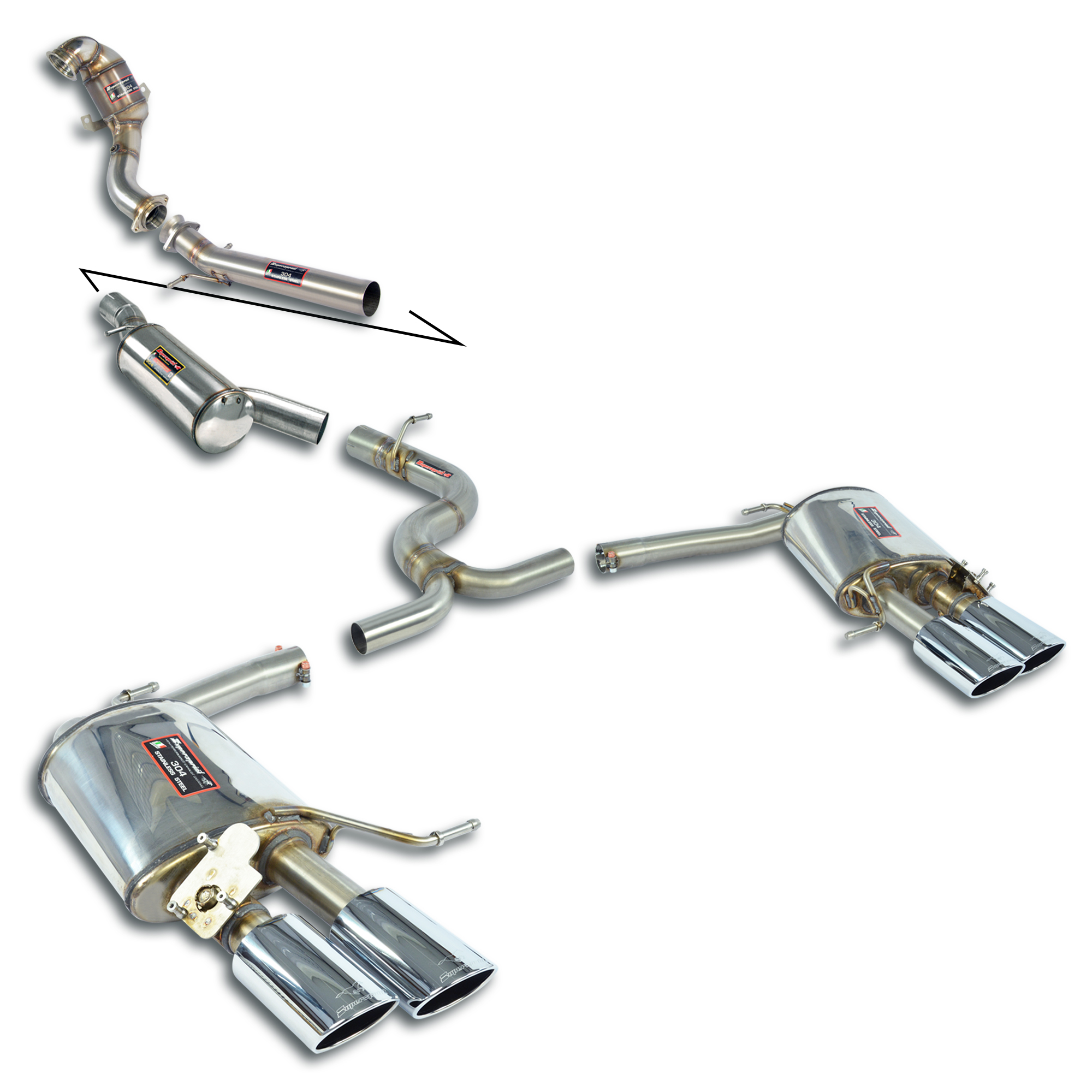 Dieser Supersprint-Auspuff mit seinem großvolumigen HJS Motorsport-Katalysator (130 mm) ist so dimensioniert, dass er Leistungssteigerungen beim serienmäßigen 2,0-TFSI-Motor erzielt aber auch optimal für kleine oder sogar bis hin zu radikaleren Motortuningmaßnamen bis zu einer Obergrenze von 400 PS passend ist.