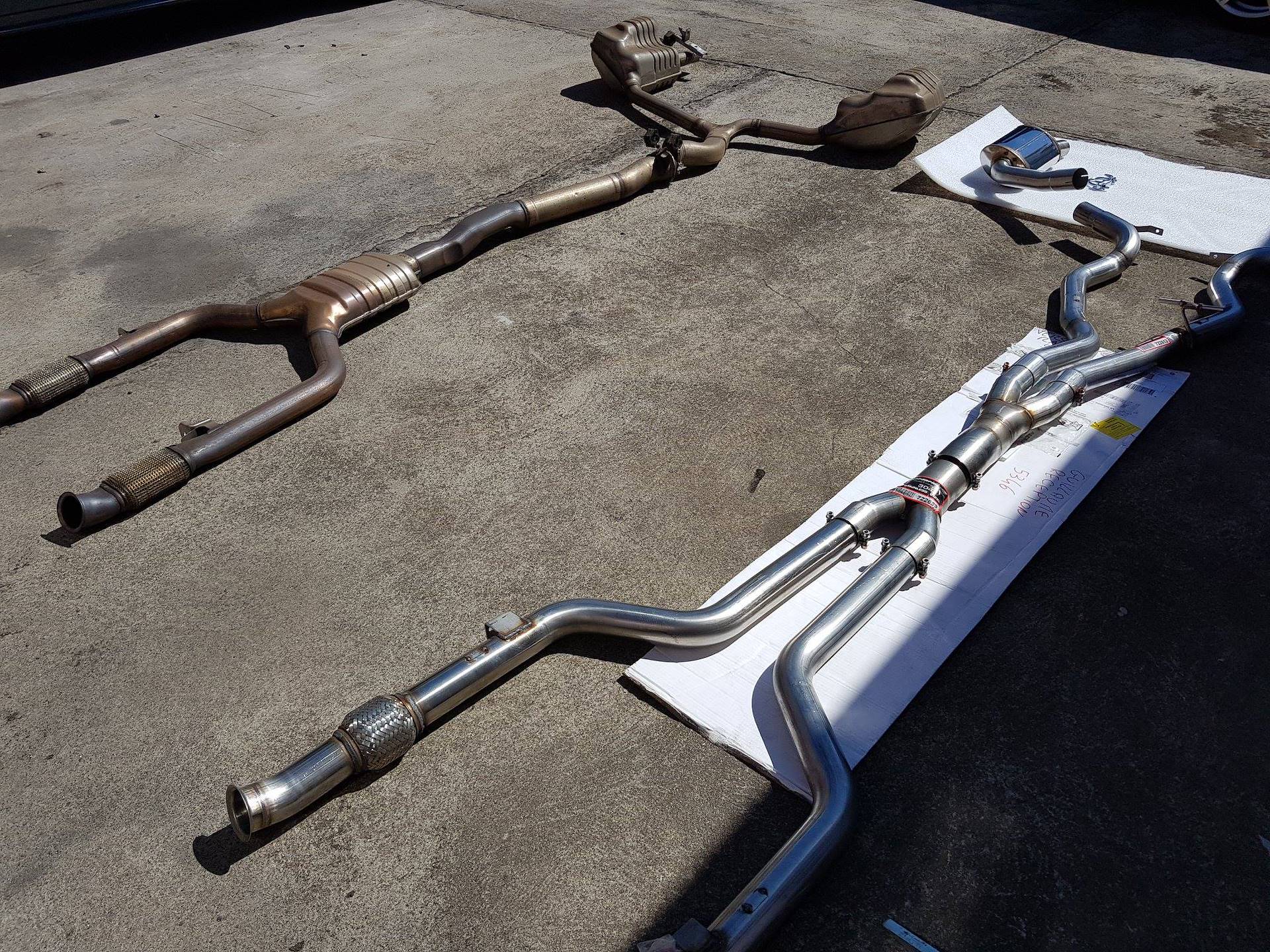 Anlage "ab-Kat." 100% Edelstahl, Twin Pipe - Für Serien Heckschürze - (GPF-Entfall) - Nur als kompletten Kit zu verwenden