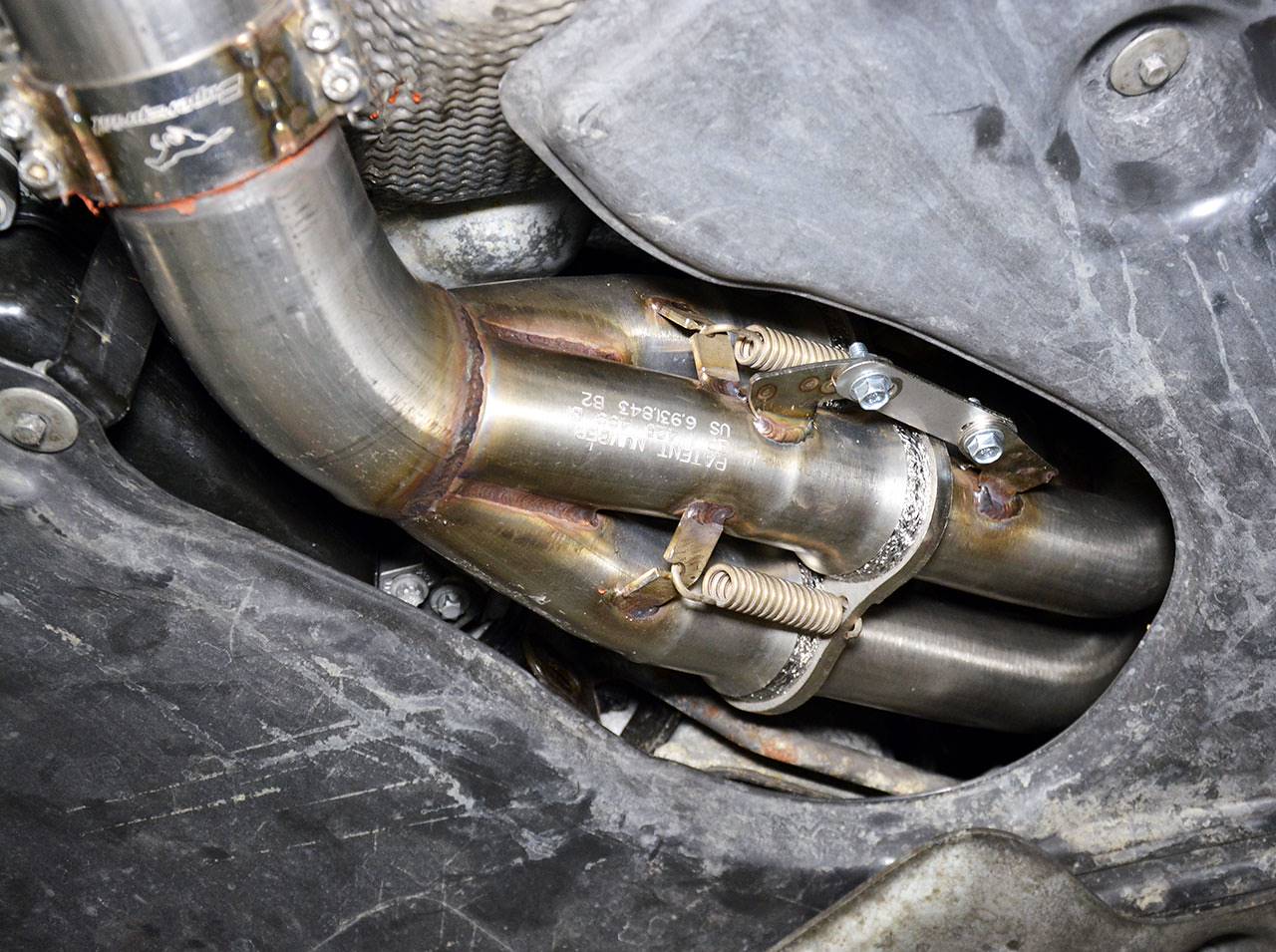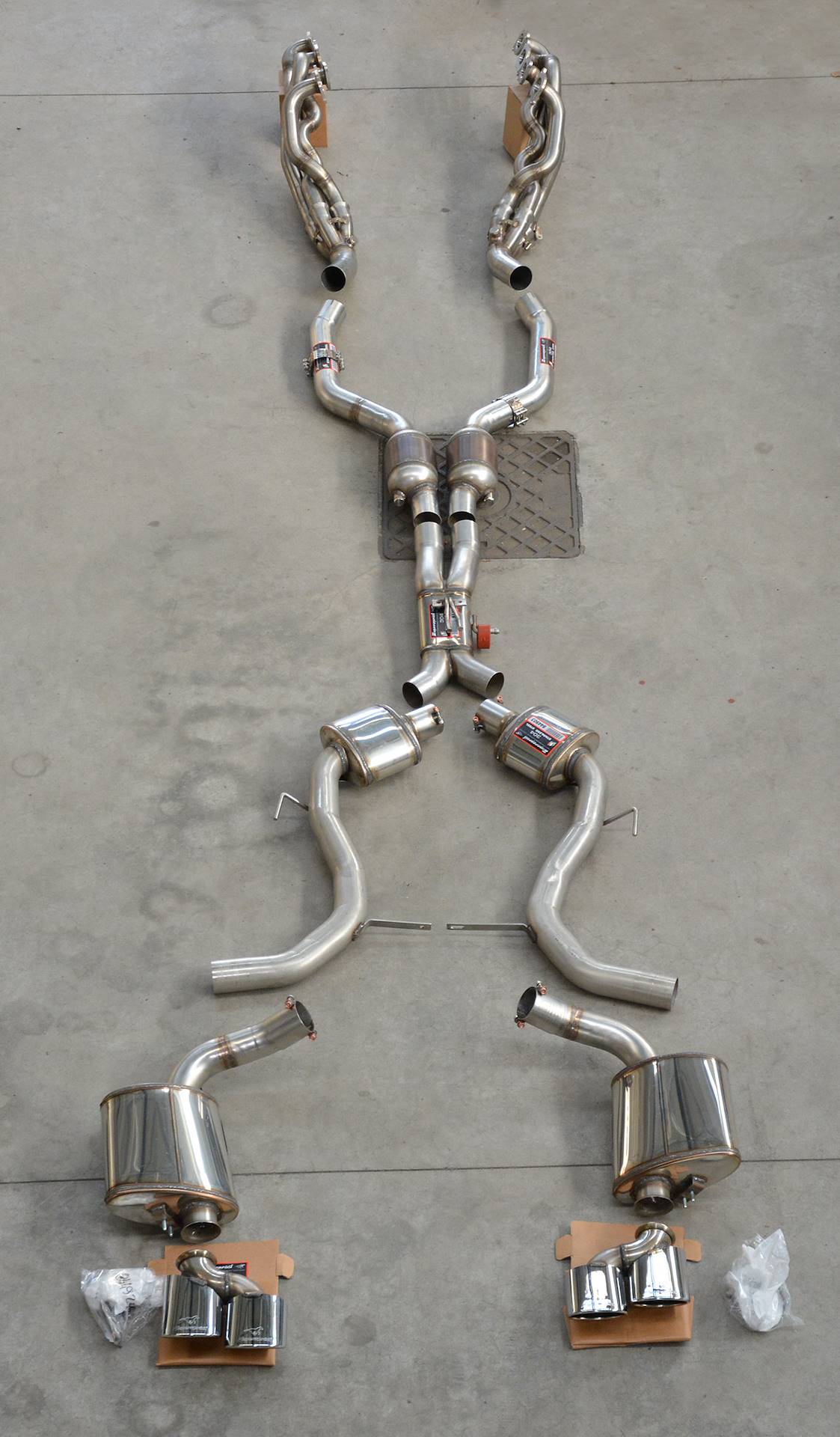 The Supersprint Tubular Headers, with their race-inspired, 4-into-1 merge collectors, use 45mm stainless piping, for each of the mandrel-bent individual primaries, and 70mm downpipes on each cilynder bank.