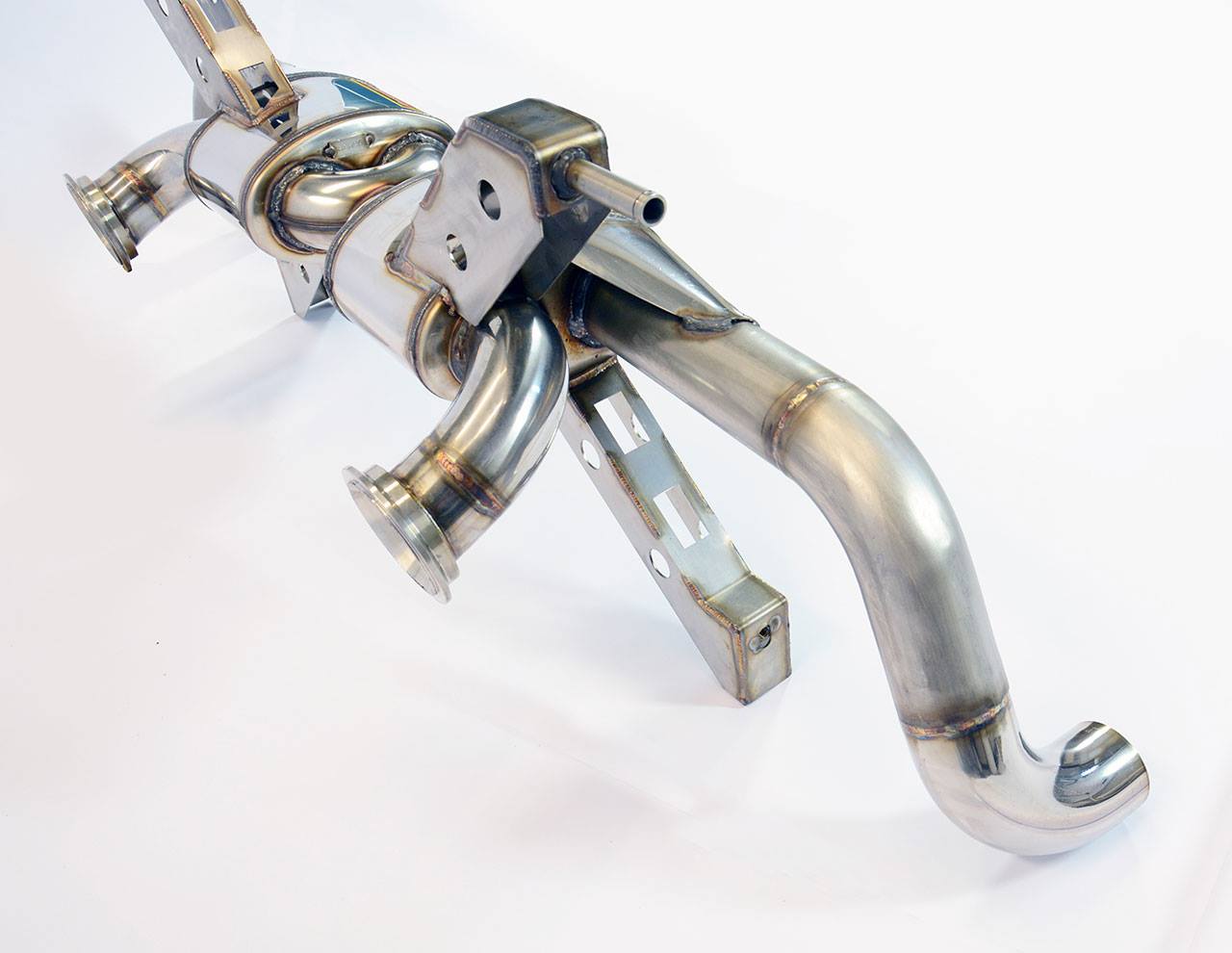 Unsere Anlage ab Krümmer eliminiert die serienmäßig in den Nachschalldämpfer integrierten, verkapselten und sehr restriktiven Sekundär-Katalysatoren und verwendet ein total freies Absorptions-Schalldämpferdesign (free-flow).