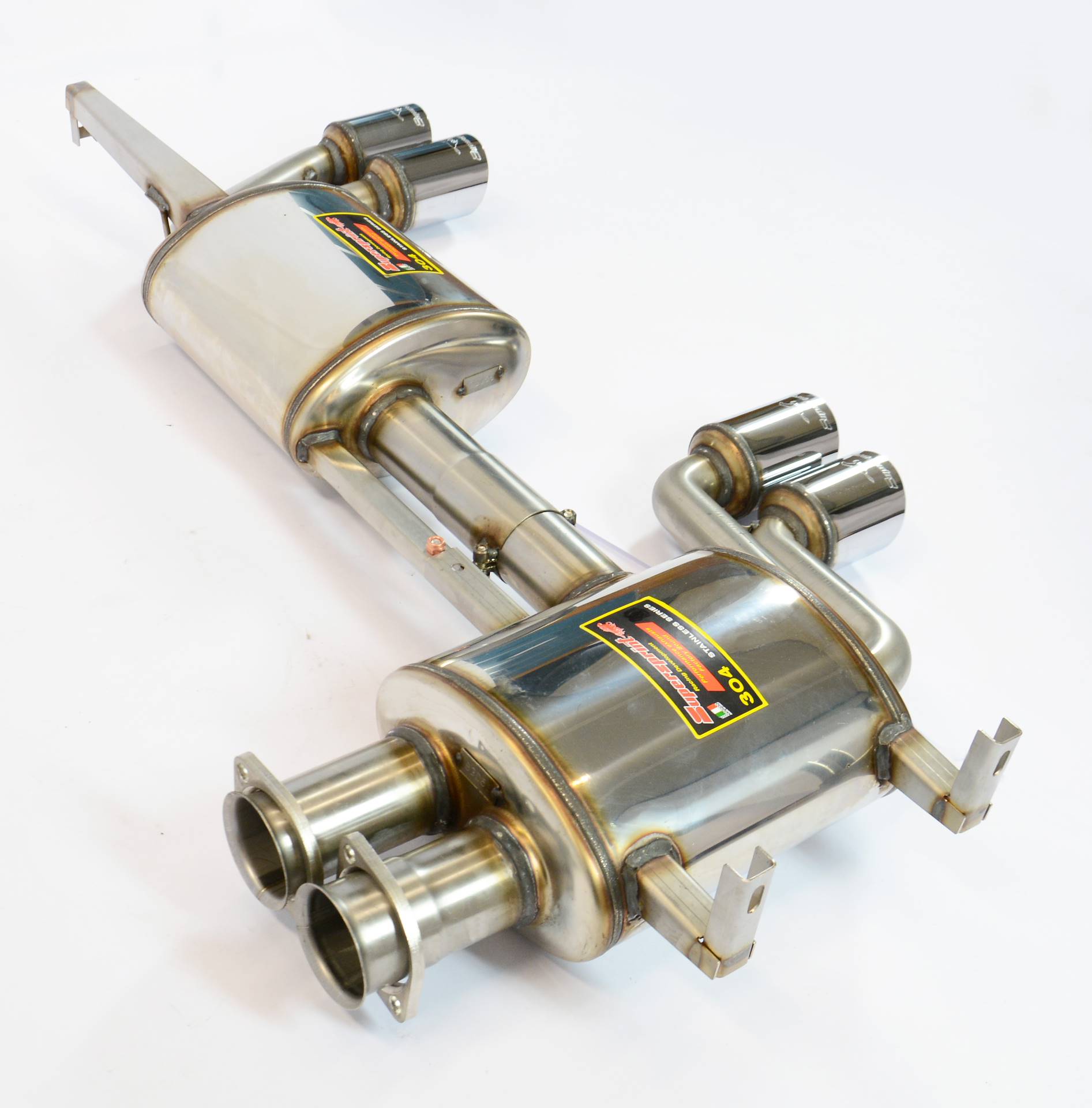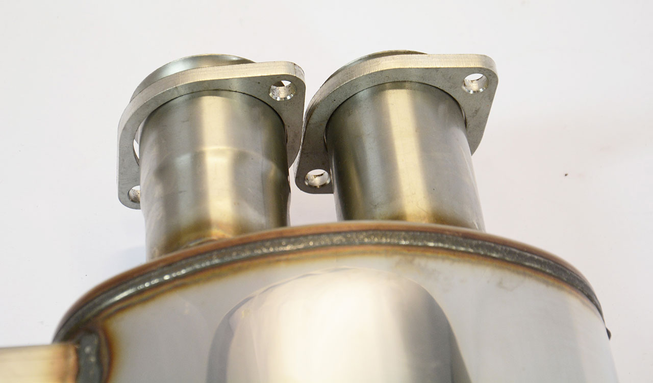 Zylinder-Einzelrohre in variablem Durchmesser, 3in1 Verbindungen mit optimalen Radien, großvolumige 100 CPSI Twin-Metallkats von HJS, geradlinige Mittelrohr-Segmente und ein Absorptions-Nachschalldämpfer.
