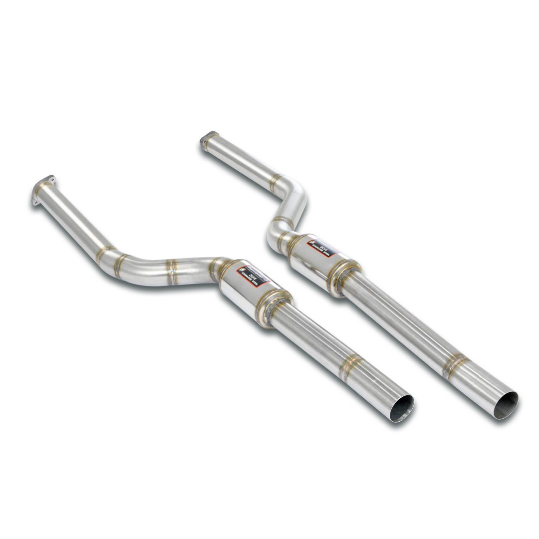 The Supersprint exhaust gets rid of the unbelievable restrictions found in the stock exhaust, which features a grand total of 6 catalytics and 2 OPF filters (3 catalytics, 1 soot filter each cylinder bank), replacing all of the redundant hardware with a set of HJS Motorsport, high flowing cats.