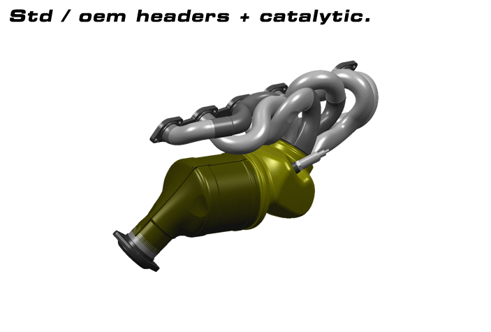 The stock, 6-into-1 tubular headers system is heavily compromised by the restrictive design of the integrated catalytics.